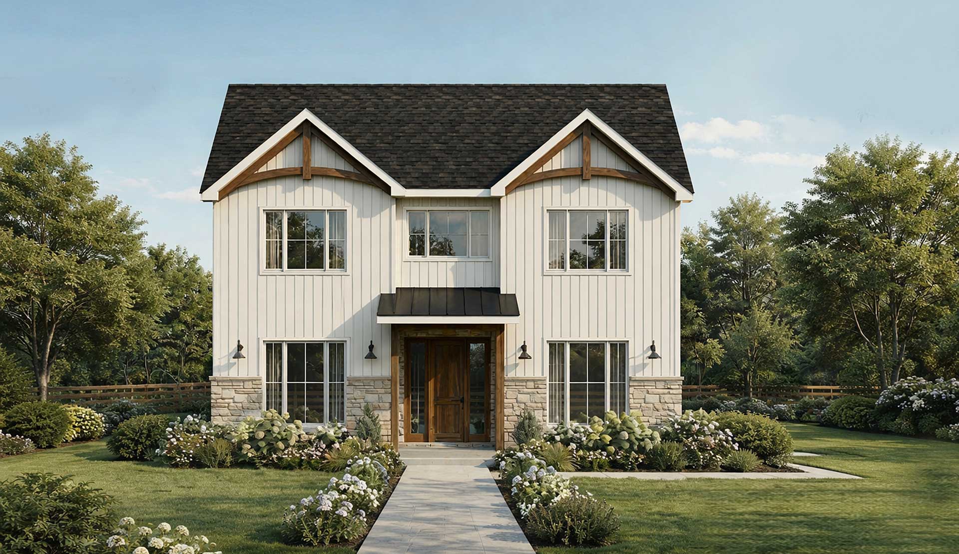 Le modèle Fairview, un cottage au style Farmhouse . L’aire de vie du rez-de-chaussée regroupe la salle à manger et la cuisine avec îlot dans un espace central ouvert. À l’étage, trois chambres, dont une chambre principale avec walk-in et salle de bain, assurent une organisation claire et une bonne séparation des espaces.