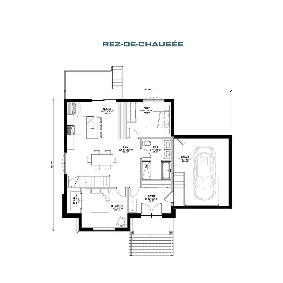 La maison Parker propose un bungalow contemporain. L’aire de vie centrale regroupe la cuisine avec îlot et la salle à manger. La maison comprend deux chambres, dont une chambre principale avec walk-in, ainsi qu’une salle de bain complète. Ce modèle possède également un garage pour une voiture.
