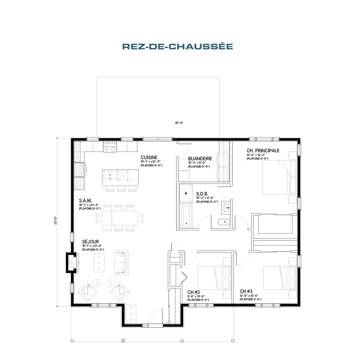 PROVOST propose un équilibre entre confort, qualité et simplicité. L’aire de vie à aire ouverte met en valeur son foyer au salon. Les trois chambres sont aménagées sur un même niveau, avec la chambre des maîtres en retrait.