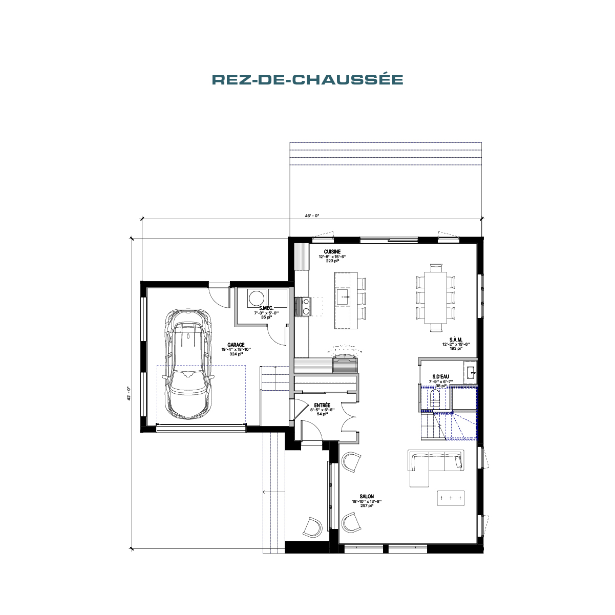 L’aire de vie du rez-de-chaussée regroupe le salon, la salle à manger et la cuisine avec îlot dans un espace ouvert. Un garage spacieux pour une voiture offre aussi du rangement en plus d’une salle mécanique.
